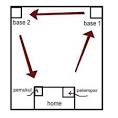 Versi lain permainan kasti yang banyak dimainkan anak anak sekolah dasar: pemain dibagi dua regu, salah satu mendapat giliran jaga dan satu regu lagi mendapat giliran untuk memukul. Disediakan beberapa pos yang ditandai dengan tiang dimana pemain serang (yang mendapat giliran pukul) tak boleh di"gebok" atau dilempar dengan bola. Pemain serang bergiliran memukul bola yang diumpan oleh salah seoarng pemain jaga. Pemain jaga berjaga dilapangan untuk mencoba menangkap pukulan pemain serang. Ketika bola terpukul pemain serang berlari ke pos berikut atau "pulang" ke "rumah" yang dibatasi dengan sebuah garis. Kalau pemain yang sedang lari menuju pos atau pulang dapat di"gebok" dia dinyatakan mati dan kedua regu berganti - regu serang jadi regu jaga dan sebaliknya. Pemain serang yang berhasil pulang mendapat satu angka. Regu yang mendapat angka terbanyak ketika pertandingan berakhir dinyatakan menang. Permainan ini memang menggunakan gerak dasar berlari, memukul bola dengan sebuah tongkat, menangkap dan melempar. Terdiri dari 2 base dengan jarak minimal 20 meter.