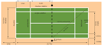 Lapangan tenis dibagi dua oleh sebuah jaring yang di tengah-tengahnya tingginya persis 91.4 cm dan di pinggirnya 107 cm. Setiap paruh lapangan permainan dibagi menjadi tiga segi: sebuah segi belakang dan dua segi depan (untuk service).